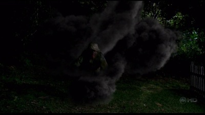 Moments after the death of his “daughter,” Ben slips into his secret room – discovered by Sayid earlier in the season – and locks Sawyer and company out. He uncovers another door, covered in strange markings – hieroglyphics? – and disappears into a dark corridor. When he emerges from the secret room (sometime within the next 20 minutes, as the sun has gone down by the time he reappears), he is covered in soot. Acting like he wasn’t even gone, he tells the others to run for the trees when he gives the word. Then everything starts to shake, and in what may be one of my favorite shots in Lost history, the Smoke Monster careens through the forest and starts going to town on the freighter team hidden just beyond the tree line. Following Ben’s orders, the others leave the house and watch as the Black Smoke runs wild, flashes of light popping in the dark, a fleeing gunman literally grabbed by the billow and pulled back (a sight we’ve seen before, but one that’s new and shocking for Sawyer, Hurley, Claire and Miles). Unafraid, Ben sends the others on while he goes to say a final goodbye to Alex. As he approaches her and sits by her side, the smoke attack subsides.