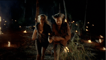 Things just keep getting better for the islanders when out of absolutely nowhere, they fall under attack from a barrage of flaming arrows, the first of which fatally skewers poor fretful castaway Neil, aka Frogurt (whose presence in these first two episodes connects to one of the minisodes that were created during Season Four. Feel free to go digging for the link. And I guess technically, the first arrow doesn’t kill him. He takes two more before he dies. Grisly…).