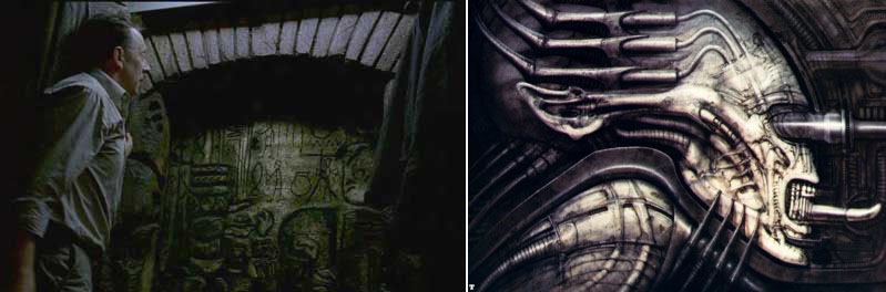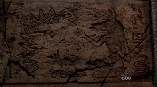 Above the grid of holes in the ground from which Smokey will soon waft, there are more hieroglyphic carvings. The main image is of Anubis, an Egyptian god, kneeling or crouching and reaching out its hand toward some sort of demon or devil whose head is growing out of a jagged body that may actually be the Black Smoke. The sharp figure starts small on the ground, as if coming up through the ground in a thin stream, and expands as it gets higher. It’s gotta be a depiction of the Smoke Monster, right? I thought of Indiana Jones and the Temple of Doom, when Indy enters the tunnel that leads to the underground temple and looks at a carving on the wall of the god Shiva handing the Sankara stones to a priest. Remember the statue we glimpsed from behind at the beginning of the episode LaFleur. The show’s Egyptian motif is definitely becoming more pronounced…