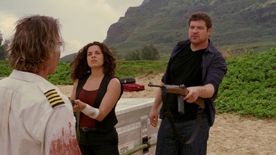 -Speaking of which, the episode’s random twist occurs when Lapidus returns to Hydra Island and learns that Ilana and a couple of other passengers have guns and have taken charge.  When Ilana asks Lapidus “What lies in the shadow of the statue?” does she mean lies as in lays down, or lies as in speaks falsehoods? And more importantly, when she says statue, does she mean that statue? The one we think she means? And even more importantly…what?!? What is she talking about? Who’s the big guy with her? What has she done with the other passengers? Is that big metal crate filled with weapons? Why does she think Lapidus will have any idea what the hell she’s talking about? Where are they headed? Note that she is now back to using the accent she used when she seduced Sayid. I’ll assume that that is her natural voice.