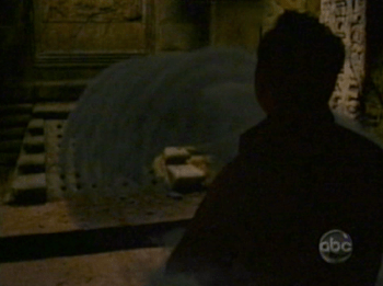 In fact, how is it that Ben was able to summon him for that attack on Keamy’s crew? Does he always have to come if called? And what are we to make of last season’s episode Dead is Dead, in which Locke led Ben to the tunnels around The Temple because that’s where he said the Monster would be? Once in the tunnel, the ground crumbled beneath Ben and he fell into a lower chamber (the hole he fell through is the same opening that Jack, Kate, Hurley and Jin had to carefully edge around with Sayid in this episode). Locke disappeared to get some rope, but then Ben found those openings on the ground from which the Smoke rose. But why did Man in Locke lead Ben there? Why not change into Smokey back at the Others’ barracks, or on Hydra Island? And if Miyagi and Daniel-san are so worried about the Man in Black getting into The Temple, wouldn’t that suggest that he must want to get to there? If he was so close that night with Ben, why not try then? Are those holes in the ground always where he comes from? If so, do the folks at The Temple know how close to them Smokey “lives?”