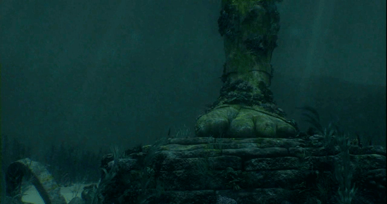 -Oh yeah, speaking of the statue, why is it – and the rest of the island – underwater? The revelation of that image at the end of the pre-credits sequence was a pretty major WTF moment. But as we never come back to it, and so much happens in the episode, I had forgotten all about it by the end. I don’t even have the smallest kernel of a half-baked theory to explain this one; I only have a question. Did we see the island in its final resting place, leaving us to wait and see how it comes to be there, or will it rise from the water before all is said and done? (In a cool nod to the show’s past, the shark that swims by just before we see the statue’s foot is branded with a Dharma logo, just like the one that circled Sawyer and Michael on the remains of the raft in Season Two’s episode Adrift.)