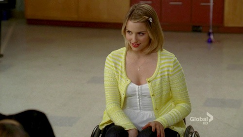 The show returned this week, and while all the commercials and publicity focused on the guest appearance by Matt Bomer as Blaine’s brother, it’s fair to assume that fans were first and foremost waiting to learn Quinn’s fate. It didn’t take long. In the opening scene, Quinn is shown coming down a hallway at school in a wheelchair, but looking otherwise as lovely as ever, all smiles and gratitude, accepting that her fate could have been much worse. “I could have easily become one of those creepy memorial pages in the yearbook, but by the grace of God I’m here,” she says to Rachel and Finn. “Believe it or not, this is the happiest day of my life.” Then she and Artie, the glee club’s resident paraplegic, proceed to duet on Elton John’s “I’m Still Standing.” After the song, Quinn tells her classmates that she suffered a severely compressed spine, which has left her feet and legs immobile (but her “plumbing” intact). She says she’s already regaining some feeling, and that with a lot of physical therapy and prayers, she should be able to walk again.