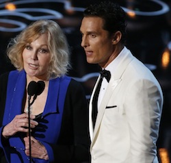 Then there was poor Kim Novak. This is another thing Oscar producers often try to do, which is trot out an old-time Hollywood star who has been out of the spotlight for years. It’s a nice idea in theory, but too often it falls flat and ends up an embarrassment for the performer. They can’t read the teleprompter. Or they try to improvise. Or they get caught up in the emotion of being back in the spotlight, but it leads to awkwardness instead of poignancy. Novak fell somewhat victim to that trap, but even beyond that, there was something off about her presentation. If she was reading from the script, then it seemed like she was trying to do this thing where she made the text sound spontaneous, but I don’t know…it wasn’t working, and Matthew McConaughey looked like he had to hold her up, physically and performance-wise. And why Kim Novak anyway? Was she meant to tie into the show’s theme of Heroes? If so, then that should have been explained when she was introduced. So why her? If elderly stars of yesteryear are going to appear on the telecast, there should be some significant reason, or they should be presenting Best Picture. I don’t know…am I just being a dick? Or was Novak’s moment onstage as painful to watch for others as it was for me? It made me sad.